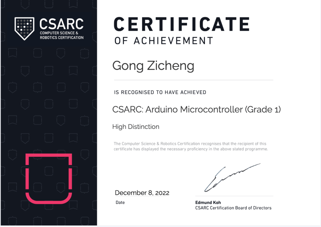 - CSARC: Arduino Microcontroller (Grade 1 / High Distinction)