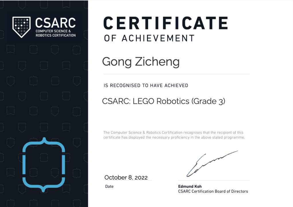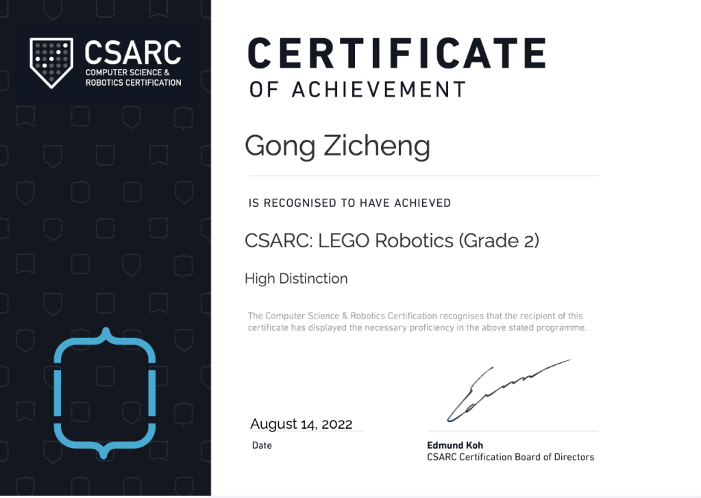 - CSARC: Certification in LEGO® Robotics for Learners (Grade 2 / Intermediate / High Distinction)